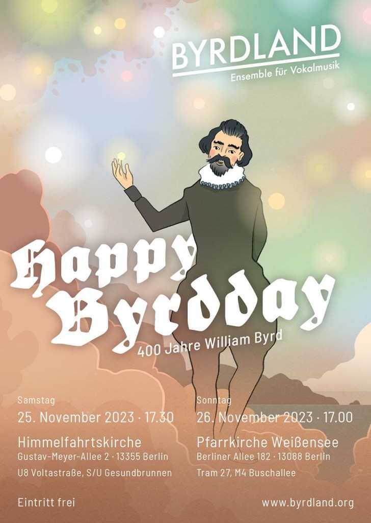 Wir befinden uns im Jubilaeumsjahr unseres Namenspatrons, und natuerlich darf ein passendes Konzert nicht fehlen. Mit viel William Byrd, aber auch mit viel Musik nach Texten vom anderen Willliam (Shakespeare), der zur selben Zeit in London lebte. Und noch ein paar weitere Ueberraschungen!